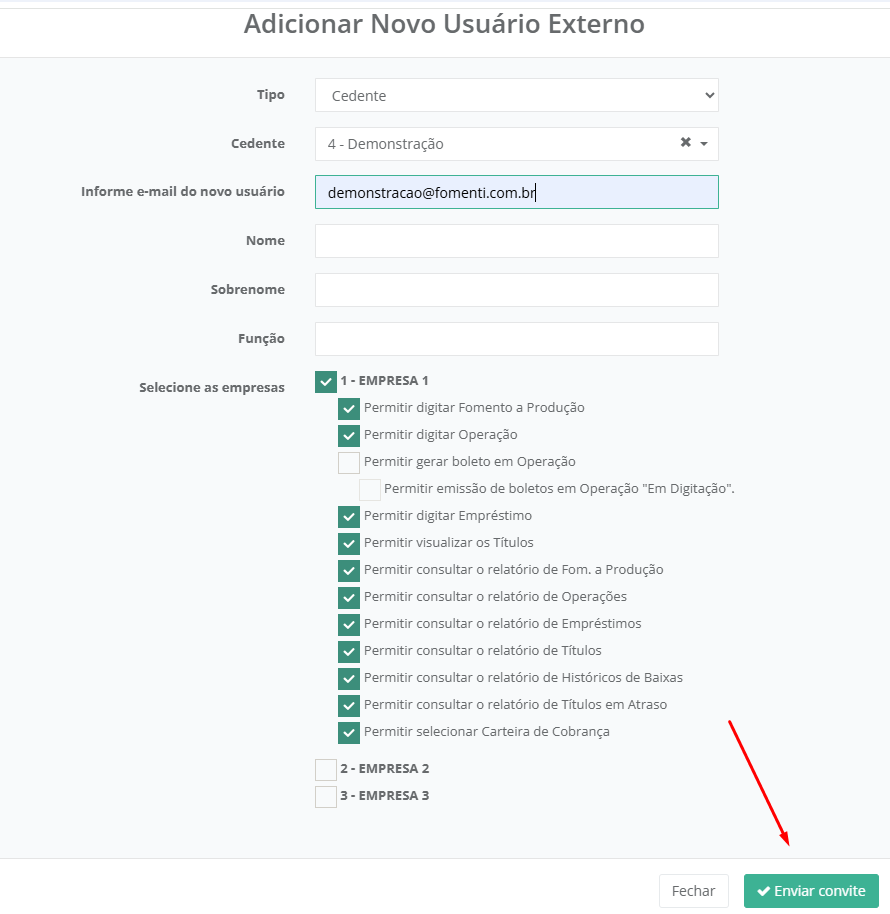 Para finalizar clique em Enviar convite para que o usuário receba um e-mail com o convite para acesso ao sistema.