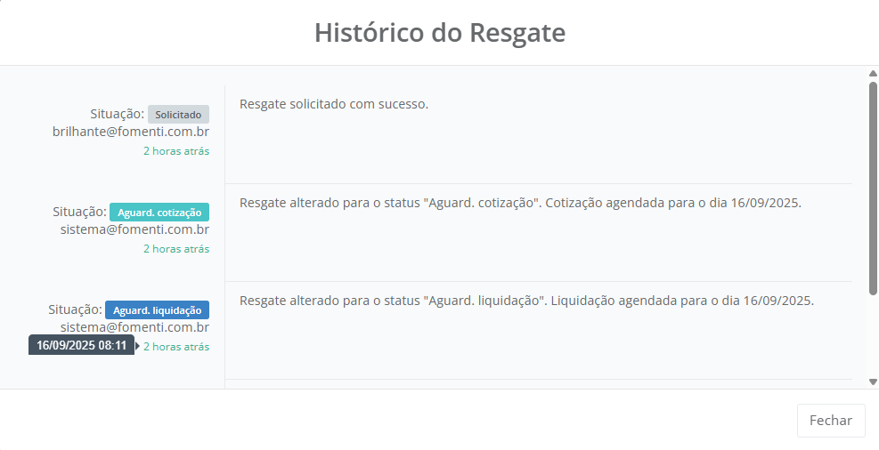 | **Data do resgate**     | Dia em que o resgate foi processado.                        |