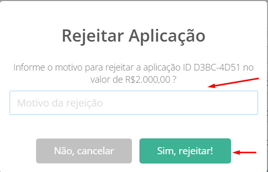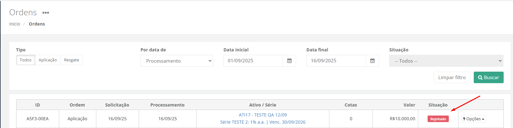 Automáticamente a situação da Aplicação ou Resgate irá ser alterada para **Rejeitado**.