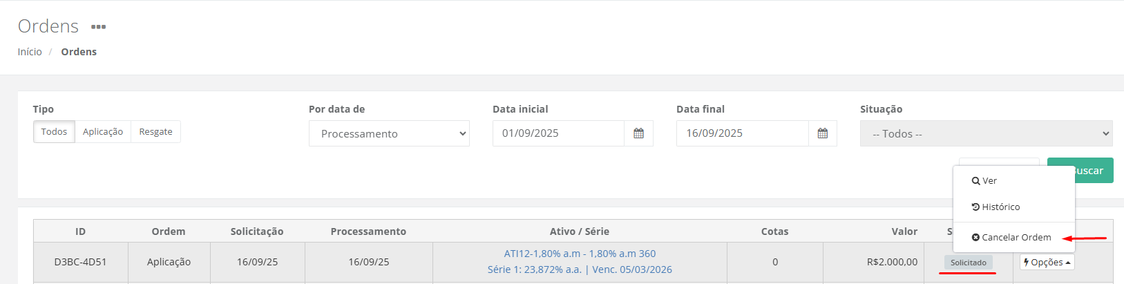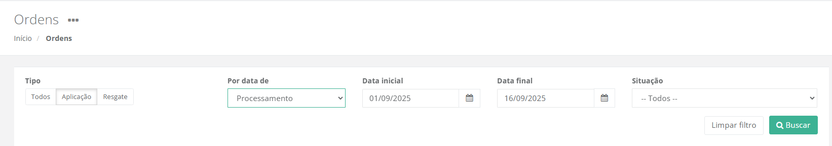 * **Aplicação**: Mostra apenas ordens de aplicação (investimento).