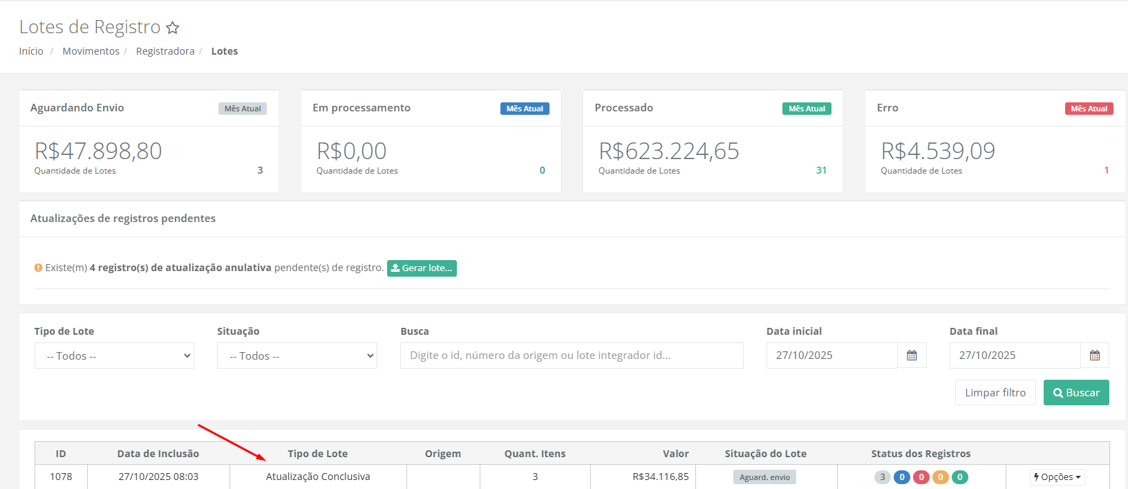 **Processado:** Lotes que foram concluídos com sucesso pela registradora.\