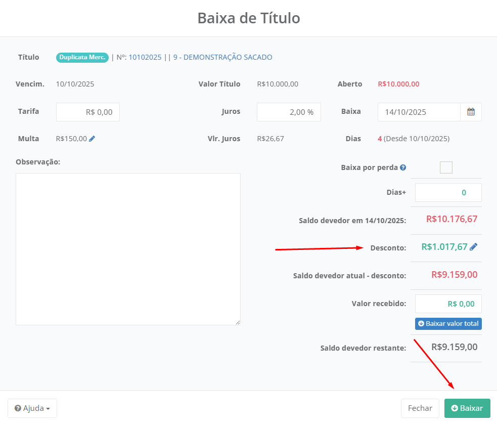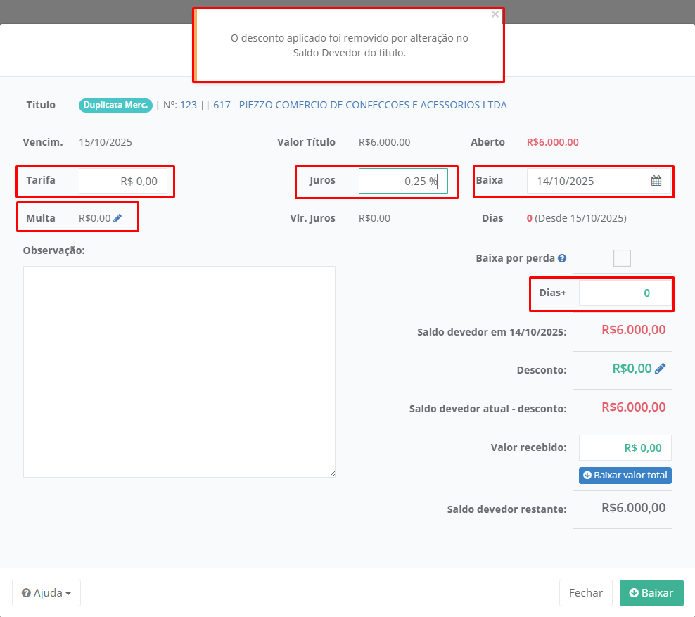 Caso o desconto seja aplicado e os campos **Juros, Multa, Tarifas, Dias** e **Data da baixa** sejam alterados, o valor de desconto será zerado, pois esses campos afetam o saldo devedor. Nesse caso deverá **lançar o desconto novamente** com o novo cálculo do saldo devedor.