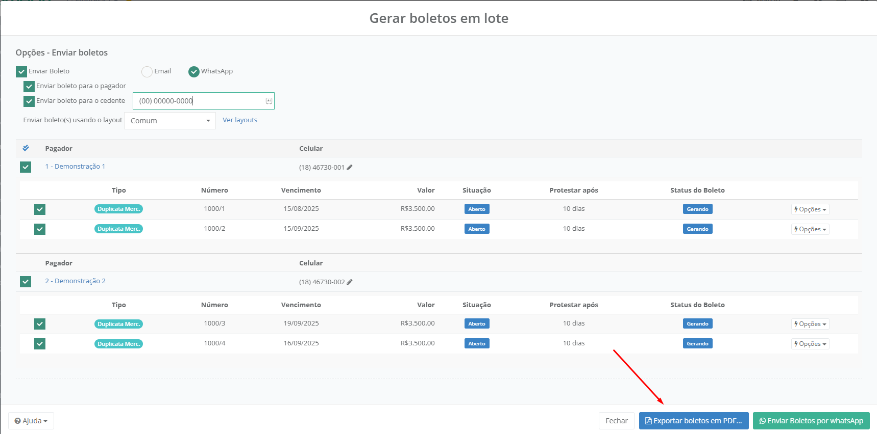 Para gerar vários boletos em lote, siga os passos a seguir: