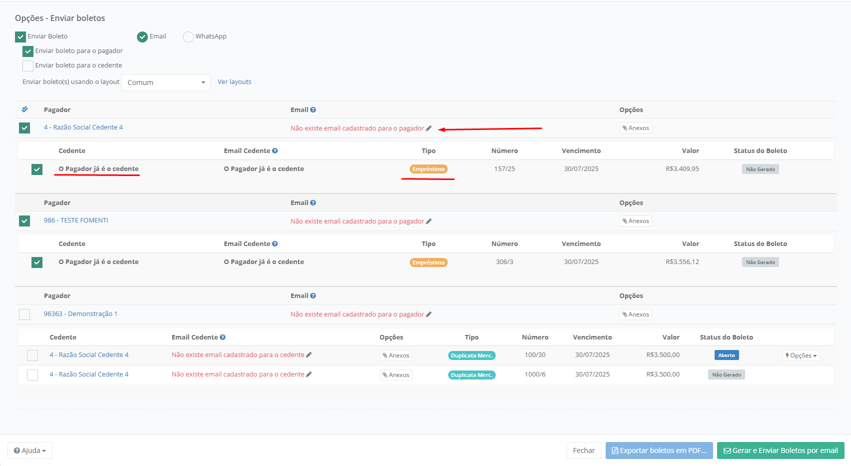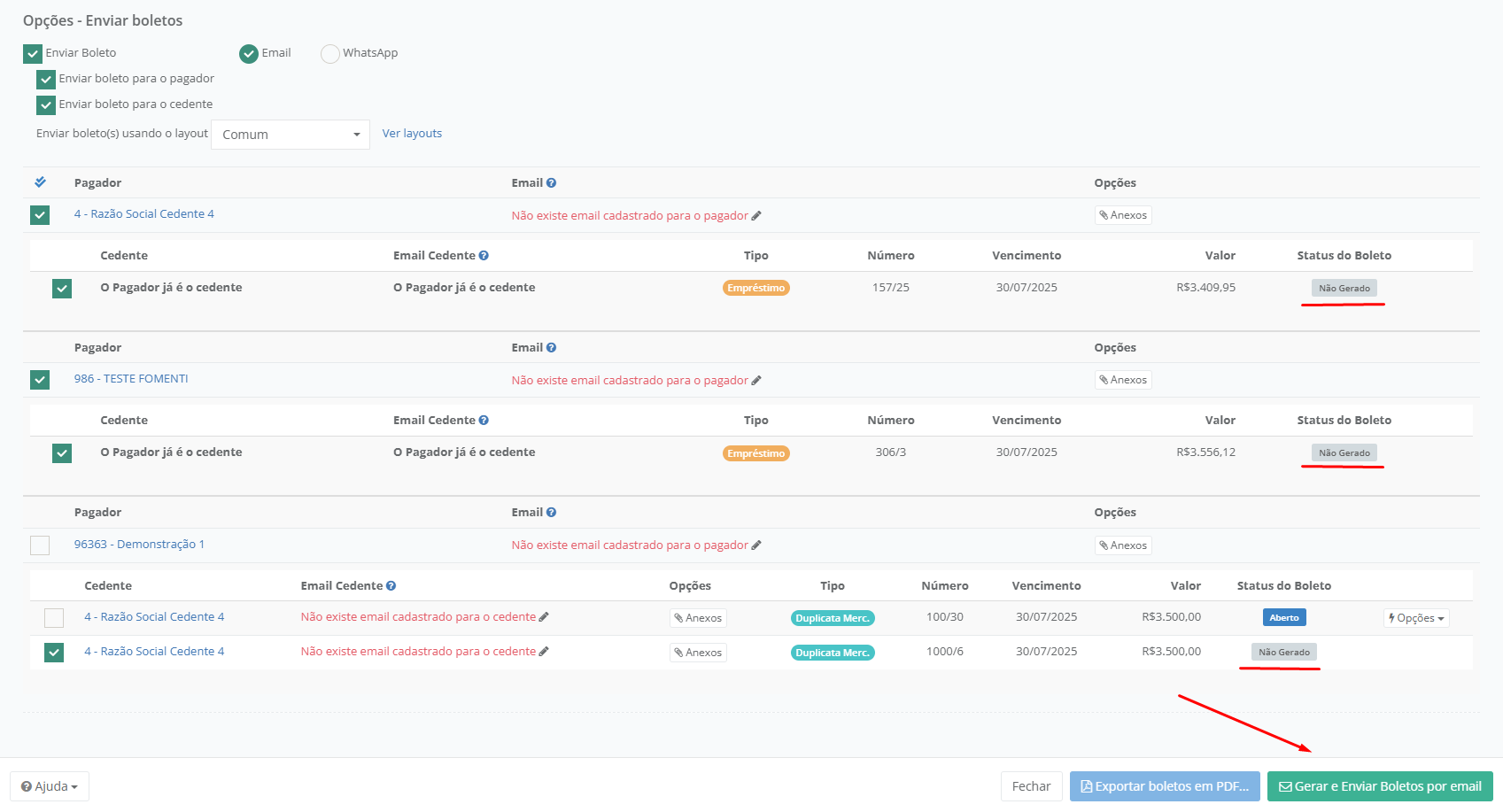 E para Enviar os Boletos por **E-mail** ou **WhatsApp** é necessário que os Títulos selecionados já tenham sido **Gerado Boletos** e estejam com o **Status Aberto**.