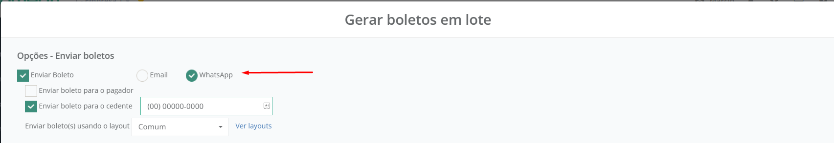 Para enviar o Boleto por **E-mail** ou **WhatsApp** é necessário ir novamente no botão **Opções** e selecionar **Enviar.** Para entender mais sobre como enviar os boletos basta seguir o mesmo passo a passo de [#gerando-boletos-em-lote](#gerando-boletos-em-lote "mention")
