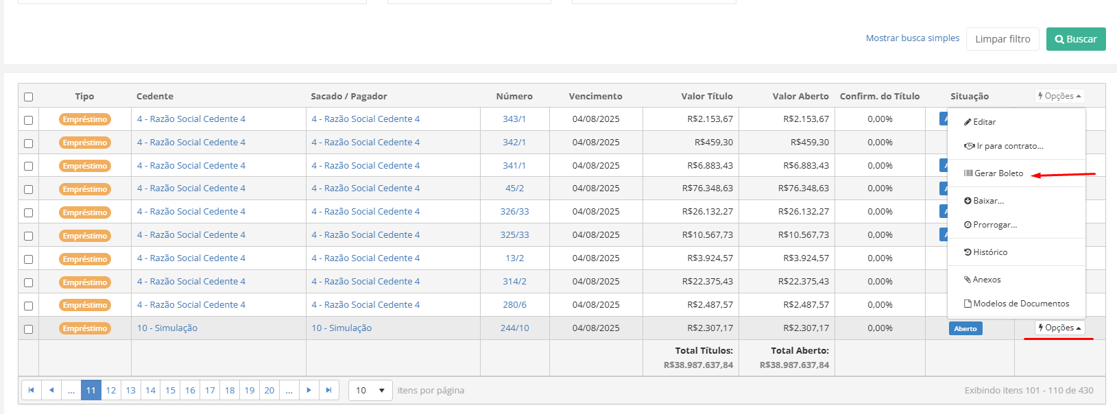 Para gerar um boleto de um título específico, clique no menu **Opções** do título e então em **Gerar Boleto**.