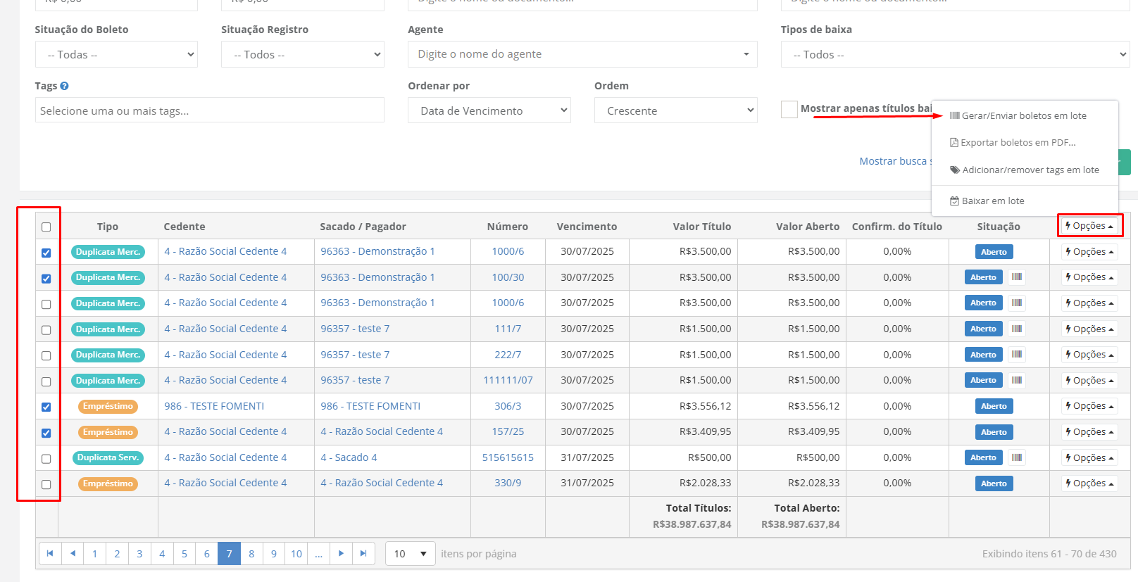 1. Na primeira coluna da lista de títulos marque a caixa dos títulos que gostaria de gerar os boletos;