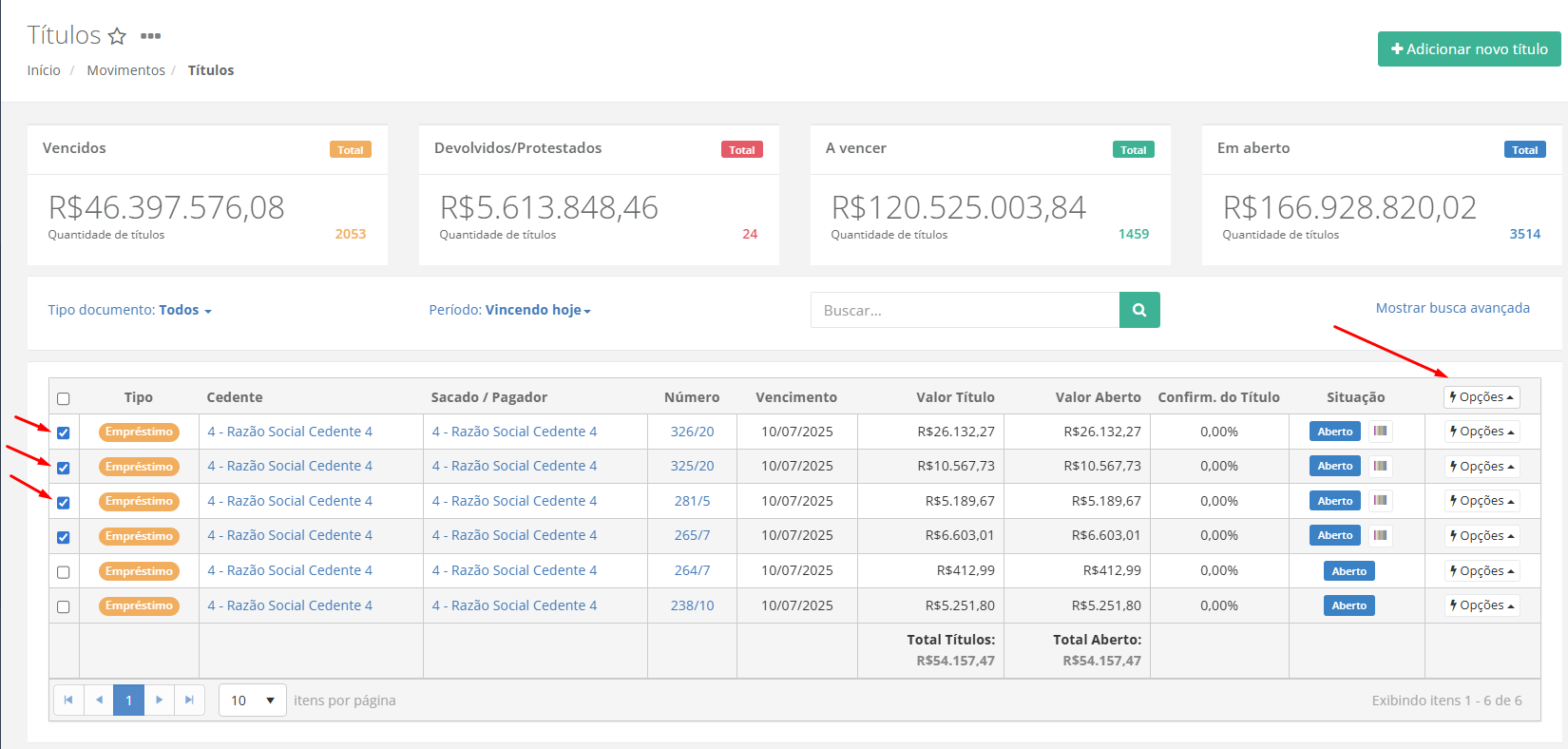 **Aberto**: O título encontra-se aberto, aguardando seu vencimento para fazer a baixa.