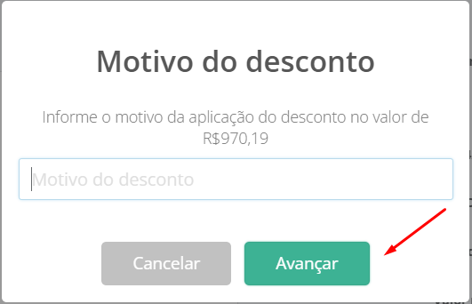 Ao clicar em Baixar, irá pedir o motivo do desconto para que fique registrado no histórico do título, para prosseguir informe o motivo e clique em **Avançar**.