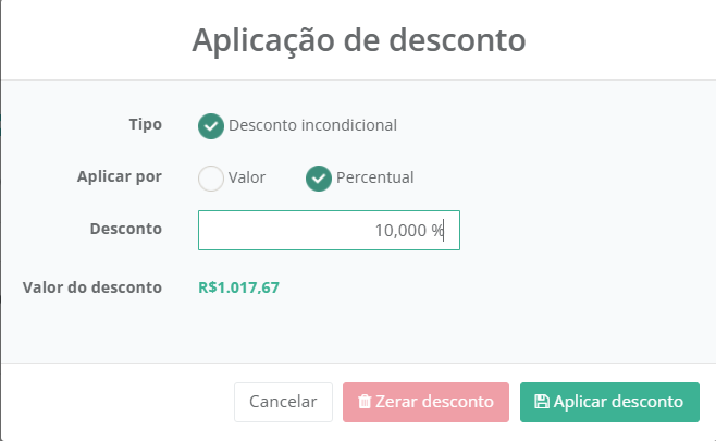Para **zerar** o campo desconto, após ele aplicado basta clicar no ícone de desconto novamente e ao abrir a tela clicar em **Zerar Desconto**.